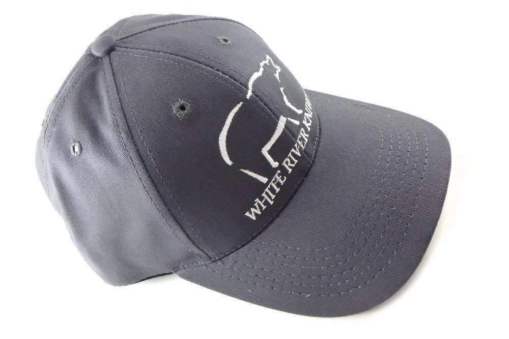MADE IN THE U.S.A. White River Knives hat. 6 panel premium brushed graphite color with white embroidered White River Knives logo. Velcro closure. Low profile has the original slick look of a low form fitting cap. Cut, sewn, and assembled in the U.S.A.