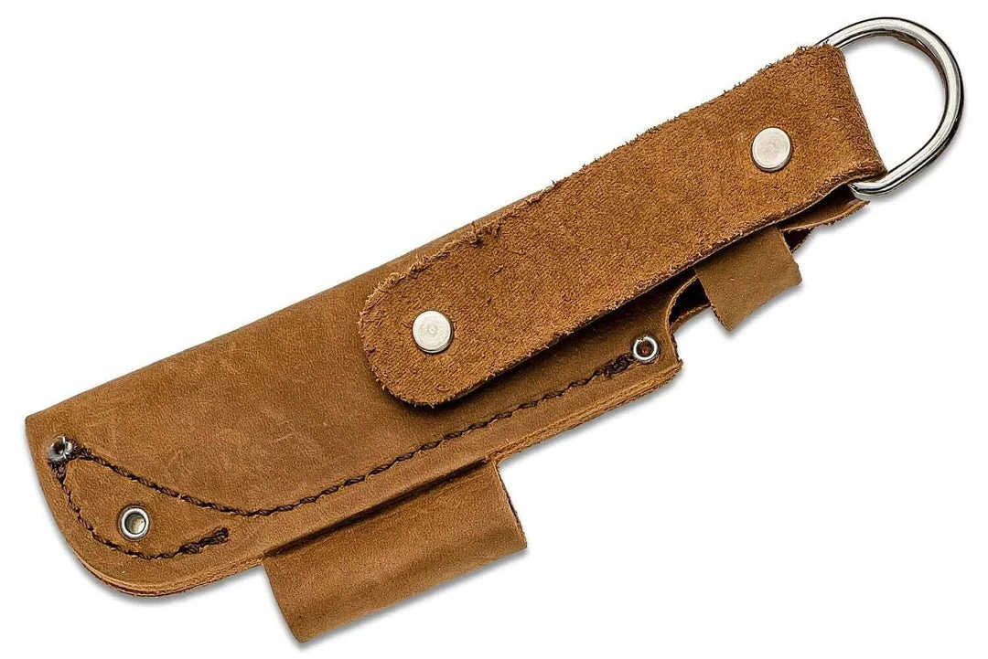 - Brushed full-grain buckskin leather sheath with D-ring and flint rod loop and retention strap
