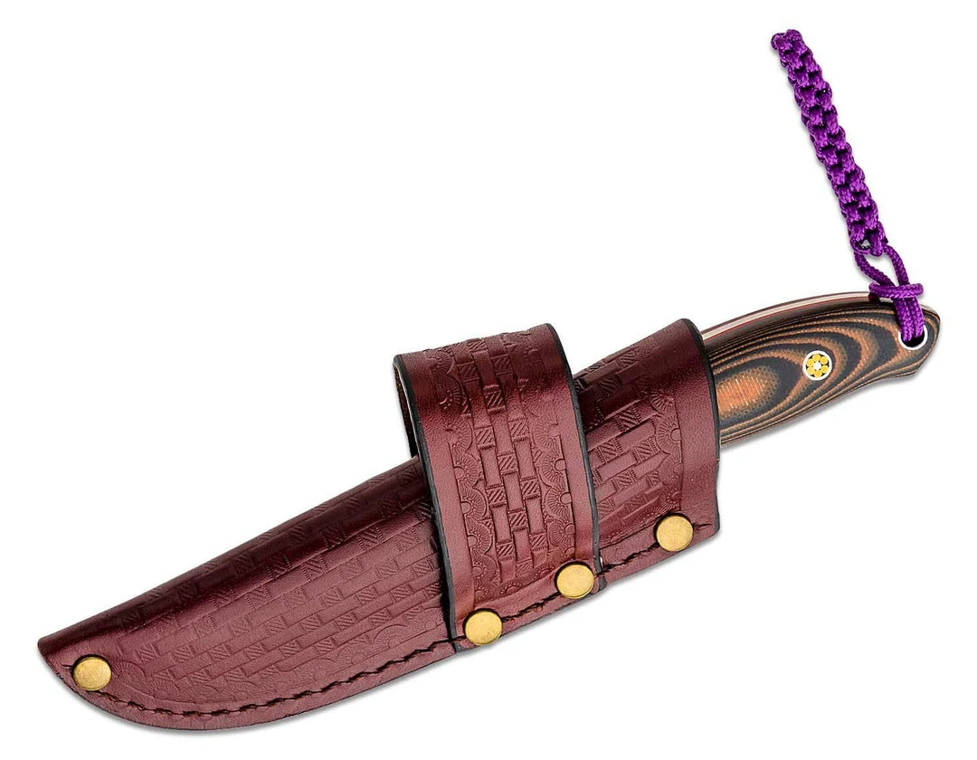 The Hunt’N Fisch is a small hunting knife with special features that make it a go-to fixed blade for many outdoorsmen. The 2.99″ blade is made from 8Cr13MoV stainless steel with a satin finish and flat ground drop point shape. Designer Larry Fischer knows the importance of a good grip, especially on a skinning knife, so he put multiple runs of jimping all over this blade to ensure a good grip, even when wet. The handle is 4.26″, made from brown and black layered G10 so this knife can be drenched in blood or caked in mud and then cleaned off with water, without any fear of damaging the design. Comes with a great drop-in leather sheath and purple braided lanyard.Â