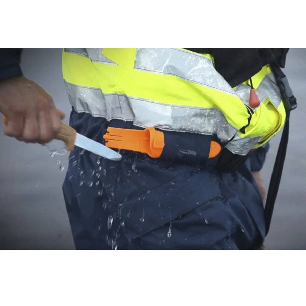 A very lightweight knife with an orange core that makes it highly visible and easy to locate. An orange high visible sheath with a smart button lets you connect and link several knives from our Craft segment, giving you the opportunity to carry your preferred combination of models. The coil formed rounding of the ergonomic handle made of cork is a pleasure to hold and doesnt conduct cold. Easy to take with you by connecting it to your belt, backpack or lifesaving vest with the clip on the sheath. The thin serrated blade of stainless steel is specially designed for cutting rope, fiber, and nylon. The rounded tip is keeping you and your boat from injuries and providing a safe practice when cutting rope or nets out on the water.