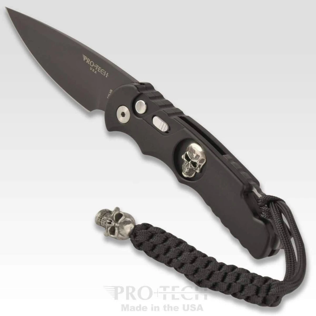 Protech TR-5.70 Skull Limited Edition Knife has a sterling silver skull carved by Bruce Shaw and inlaid into the black aluminum handles and a black DLC coated s35vn blade – limited to 300 made!