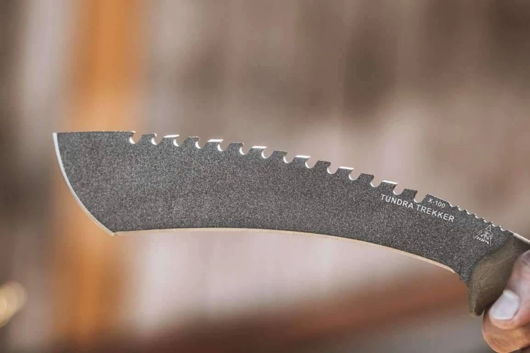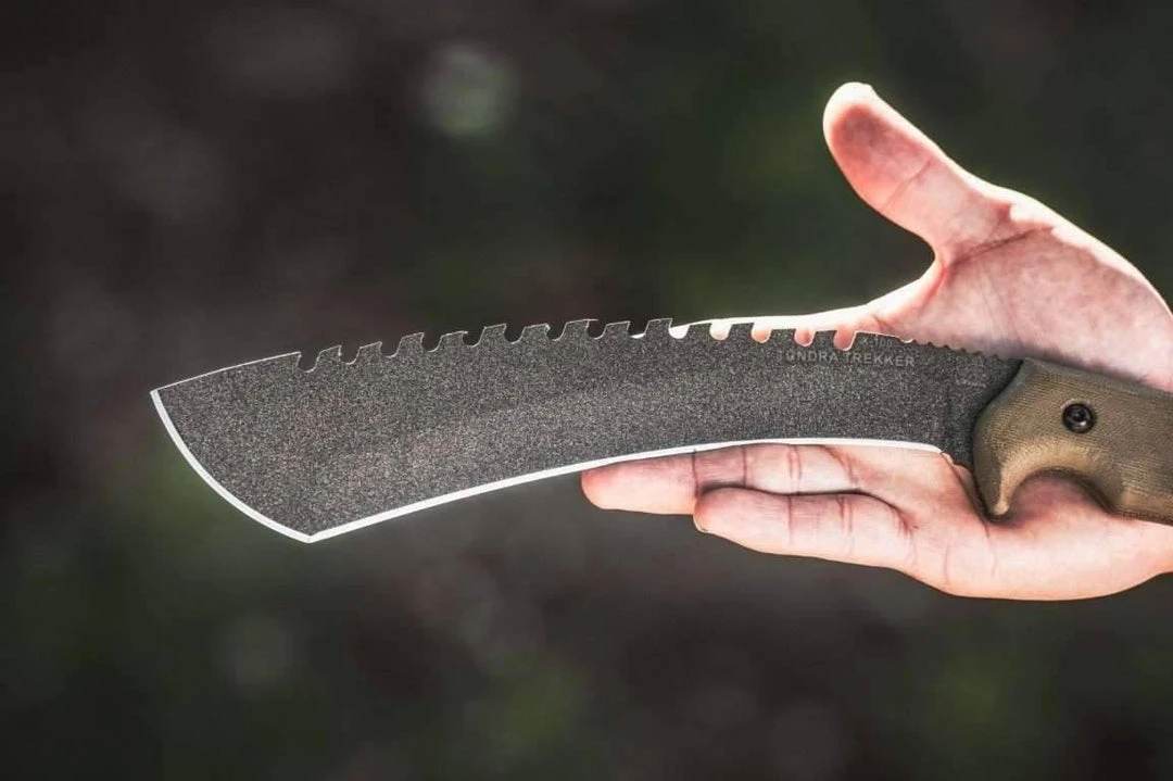 The TOPS Tundra Trekker was designed to be the ultimate outdoor fixed blade companion. This heavy duty machete style fixed blade features a curved 1095 steel blade with an aggressive sawback spine and an eye catching “Tactical Stone” finish. Comfortably contoured micarta scales offer a secure grip in difficult conditions. Take on any outdoor challenge from the tundra to the jungle with the TOPS Tundra Trekker.