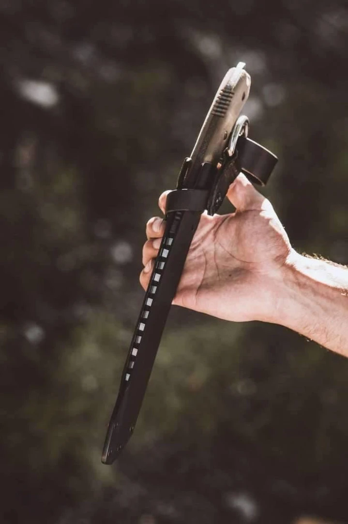 It is thinner and lighter than traditional kukris aside from the obvious fact that the blade style and saw teeth are also not something you’d see on a traditional kukri. Yet this 9″ blade made with a 3/16″ 1095 stock will be an excellent cutter in the field. The nicely rounded Micarta handles are long to provide more than one grip option for different cutting tasks. It has our opposing pitch saw teeth on the top so that users can quickly and cleanly make notches in wood when setting up camp or for certain survival tasks.